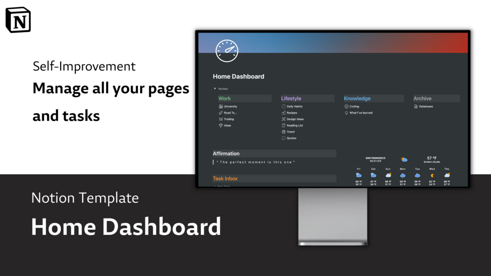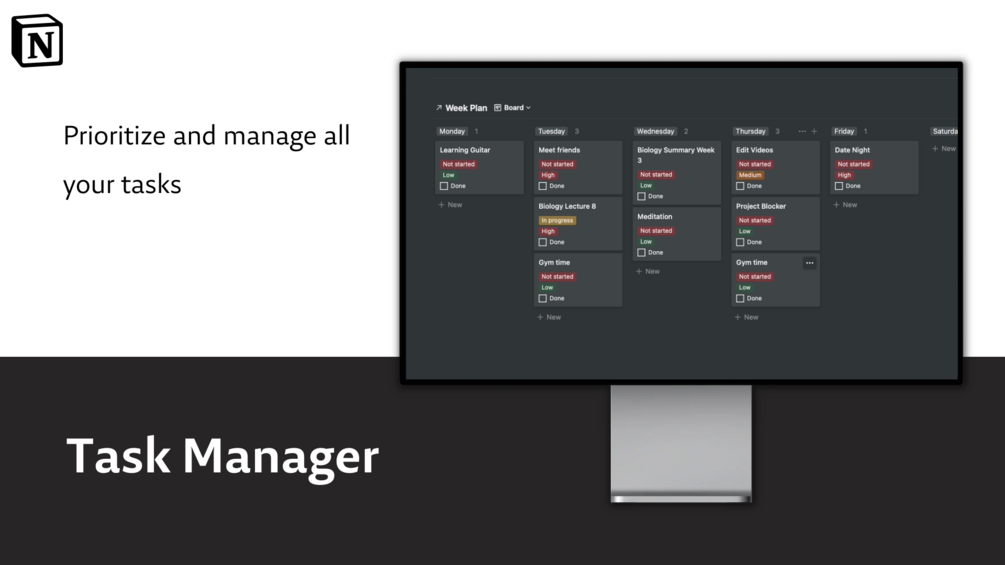 You'll be able to organize your Notion Pages in a visually appealing Dashboard. Further you'll be able to track your tasks on a weekly bases.